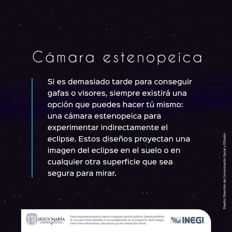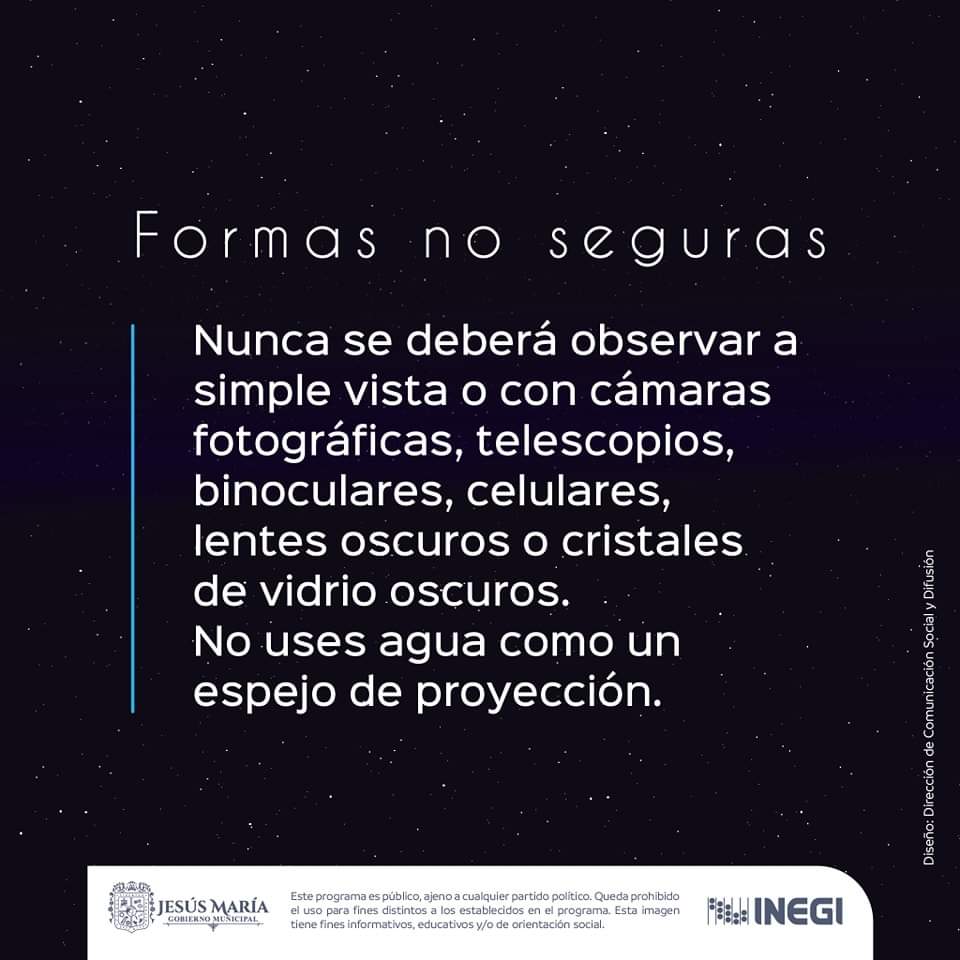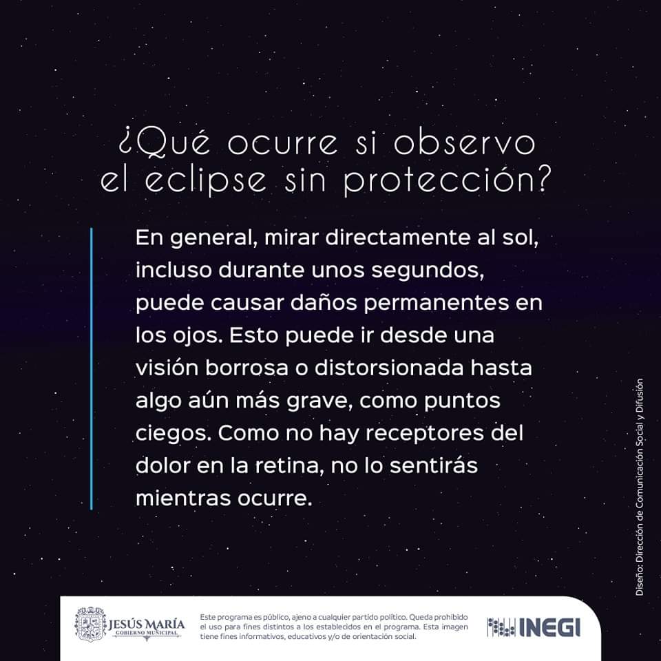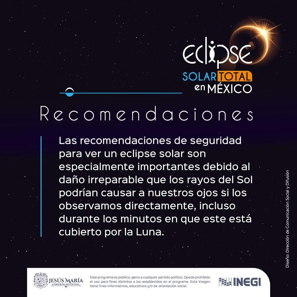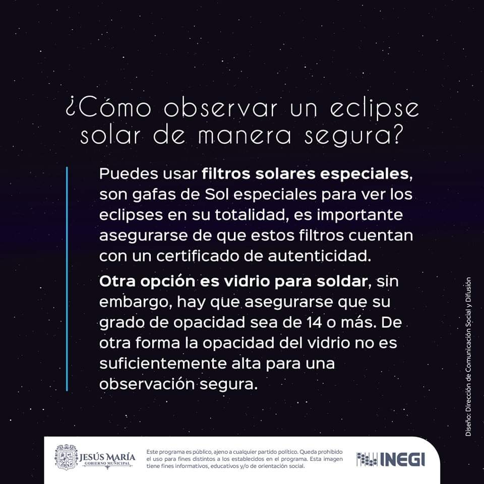 El Gobierno de Jesús María a través del Departamento de Protección Civil Municipal, informa a la población en general que es indispensable utilizar protección para ver el eclipse de sol del 08 de abril, por lo que emite algunas recomendaciones para evitar daños a la vista.