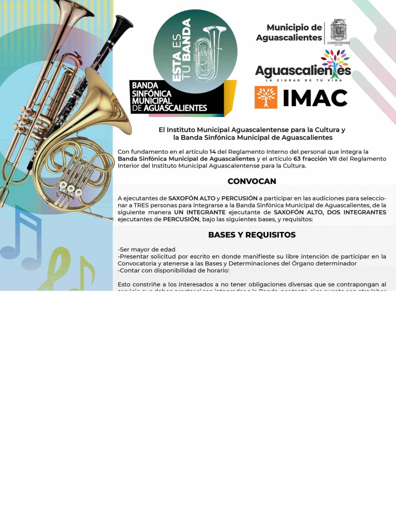 El Instituto Municipal Aguascalentense para la Cultura (IMAC) y la Banda Sinfónica Municipal de Aguascalientes abren convocatoria para formar parte de esta centenaria agrupación musical.