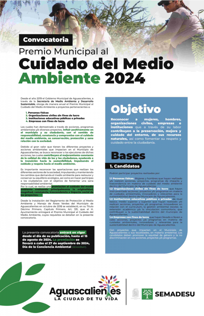 La fecha límite para inscribirse es el 15 de agosto de 2024 y la premiación se proyecta se lleve a cabo el 27 de septiembre de 2024, en el marco del Día de la Conciencia Ambiental.