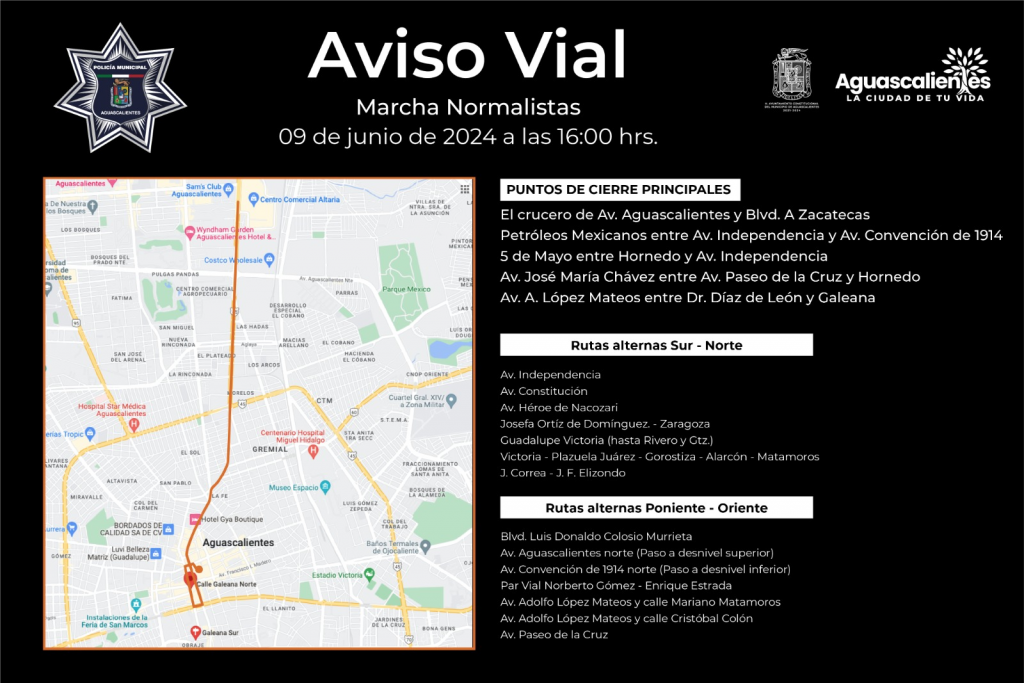 El secretario de Seguridad Pública Municipal de Aguascalientes, Antonio Martínez Romo, instruyó a los elementos de la Policía Vial de Aguascalientes a realizar cierres parciales en algunas calles y avenidas de la ciudad con el propósito de brindar seguridad a los participantes conforme al paso del contingente, y a su vez, orientar a los conductores respecto a las rutas alternas.