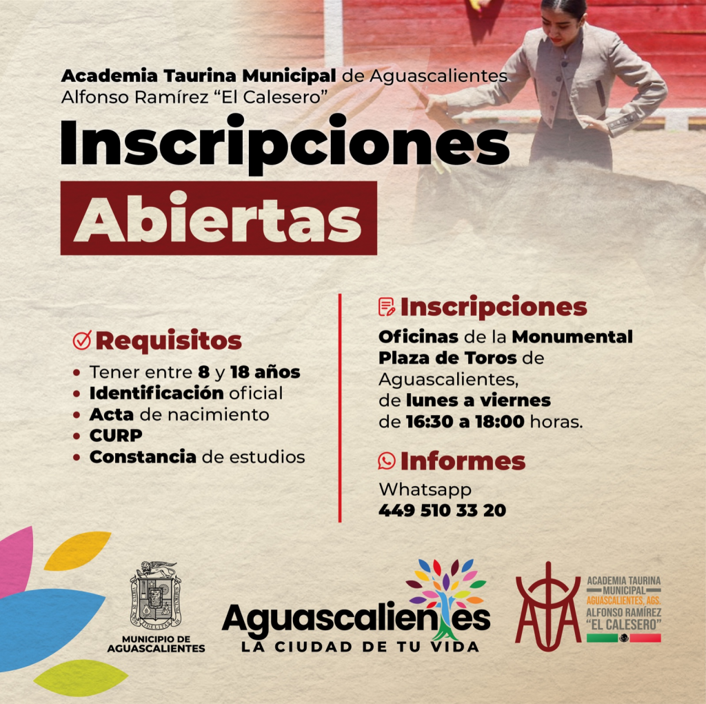 Los interesados pueden acudir de lunes a viernes, de las 16:30 a las 18:00 horas a la Plaza de Toros Monumental de Aguascalientes en compañía de sus padres o tutores con una identificación, acta de nacimiento, CURP y una constancia de estudios reciente.