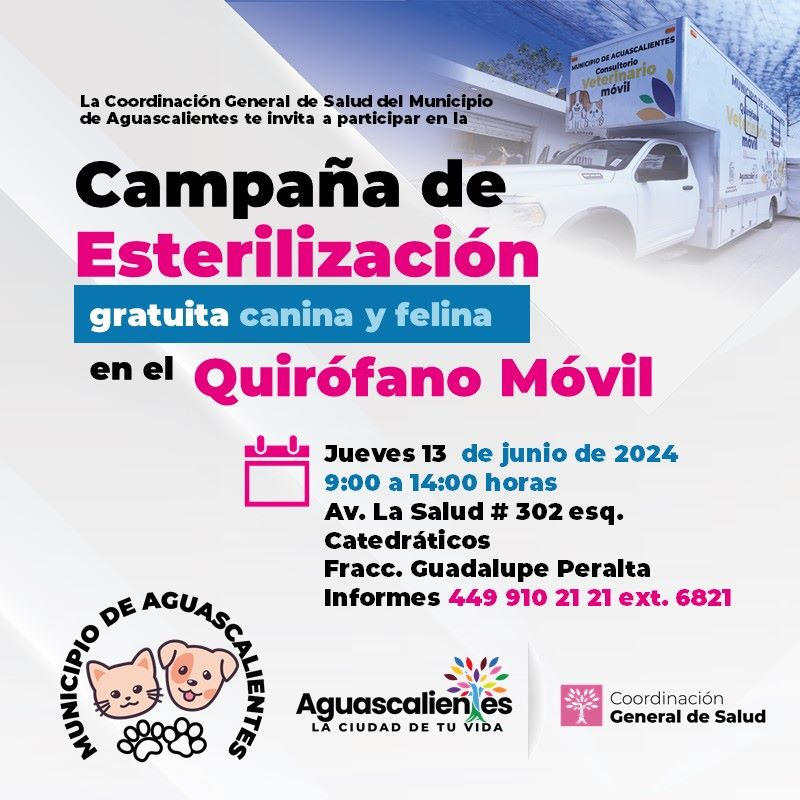 La coordinadora general de Salud del Municipio de Aguascalientes, Dulce Andrade Lovera, dio a conocer que este jueves 13 de junio, se llevará a cabo una campaña de esterilización gratuita canina y felina en el Quirófano Veterinario Móvil, en el fraccionamiento Guadalupe Peralta.