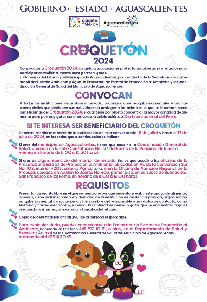 El Gobierno del Estado y el Municipio de Aguascalientes invitan a asociaciones protectoras de animales, albergues y refugios a participar en la convocatoria Croquetón 2024 y recibir parte de las croquetas recabadas.