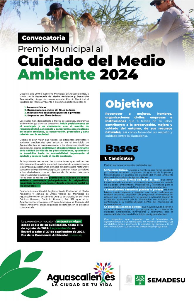 Continúa abierta la convocatoria para participar en el Premio Municipal al Cuidado del Medio Ambiente 2024, a través de la cual, el Municipio de Aguascalientes busca reconocer a mujeres, hombres, organizaciones civiles, empresas e instituciones, que con su labor contribuyen a la preservación, mejora y cuidado del entorno, de los recursos naturales, así como a fomentar su respeto y cuidado entre la ciudadanía.