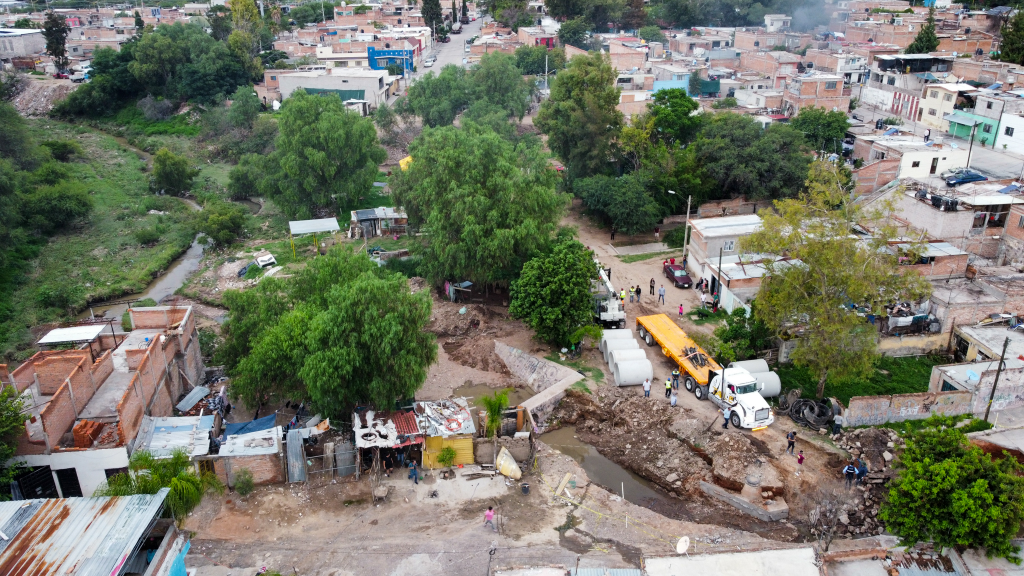Continúa el presidente municipal, Leo Montañez la supervisión de los trabajos de rehabilitación del colector pluvial en la colonia Vicente Guerrero, que resultaron afectados tras las recientes lluvias en Aguascalientes.