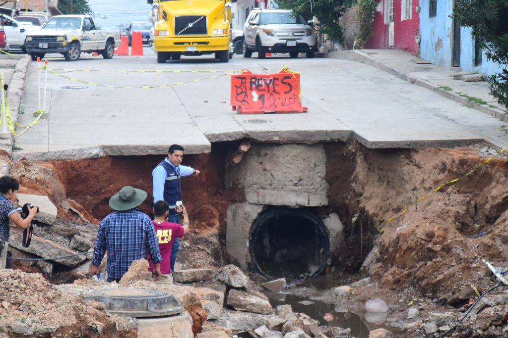 Continúa el presidente municipal, Leo Montañez la supervisión de los trabajos de rehabilitación del colector pluvial en la colonia Vicente Guerrero, que resultaron afectados tras las recientes lluvias en Aguascalientes.