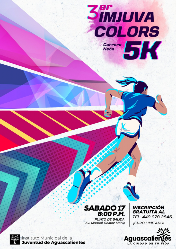 El Instituto Municipal de la Juventud de Aguascalientes (Imjuva), invita a las y los jóvenes a la carrera anual de colores “IMJUVACOLORS 2024”, que se realizará el sábado 17 de agosto en la Av. Gómez Morín y Av. Alameda, como parte de las actividades por el mes de la juventud.