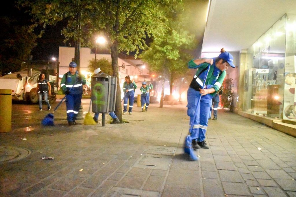 La Dirección de Limpia y Aseo Público ha dispuesto de más elementos que apoyan en la limpieza de la plaza de armas con barrido manual y vaciado de cestos papelero, contenedores adicionales y tambos que han sido colocados para el depósito de basura.