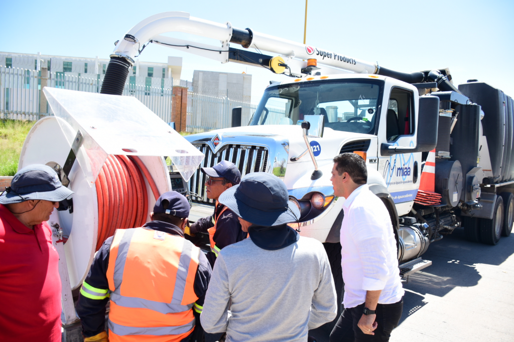 En el par vial de Gabriela Mistral y Enrique Estrada, Leo Montañez señaló que el equipo Vactor del Modelo Integral de Aguas de Aguascalientes (MIAA), lleva a cabo trabajos de desazolve para liberar la vialidad.
