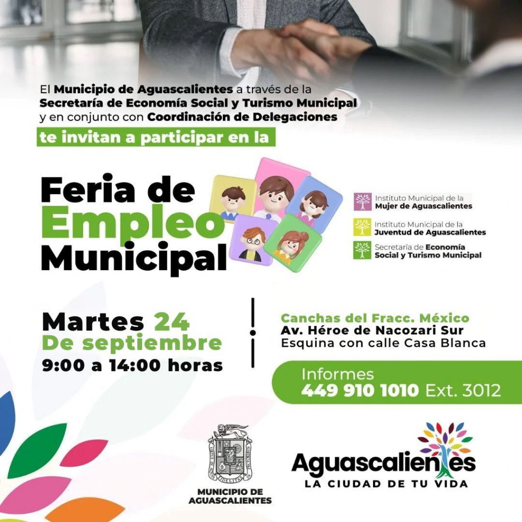 El Municipio de Aguascalientes, a través de la Secretaría de Economía Social y Turismo Municipal (Setum), invita a la Feria del Empleo, que se llevará a cabo el martes 24 de septiembre en las canchas del fraccionamiento México, ubicadas en Av. Héroe de Nacozari Sur, esquina con calle Casa Blanca, de 9:00 a 14:00 horas.