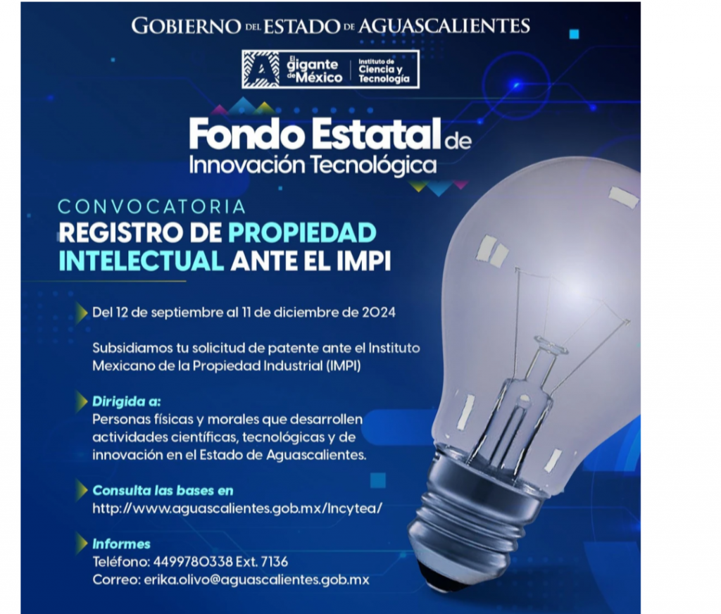 on el objetivo de proteger la propiedad intelectual de la comunidad científica de Aguascalientes, el Gobierno del Estado invita a las personas interesadas a participar en la convocatoria del Fondo Estatal de Innovación Tecnológica (FEIT) 2024, a través de la cual recibirán un apoyo económico para cubrir hasta el 100 por ciento del registro de patente ante el Instituto Mexicano de la Propiedad Industrial (IMPI).