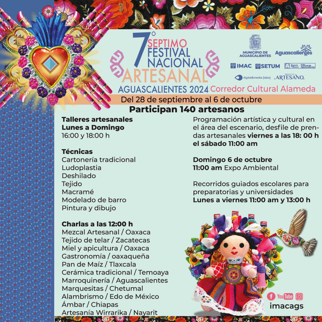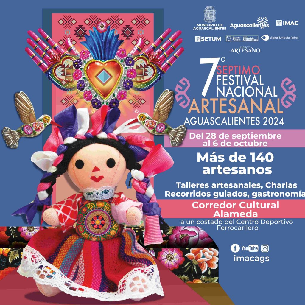 El Ayuntamiento de Aguascalientes a través del Instituto Municipal Aguascalentense para la Cultura (Imac), invita a disfrutar del Séptimo Festival Nacional Artesanal que se llevará a cabo en el Corredor Cultural Alameda, del 28 de septiembre al 6 de octubre.