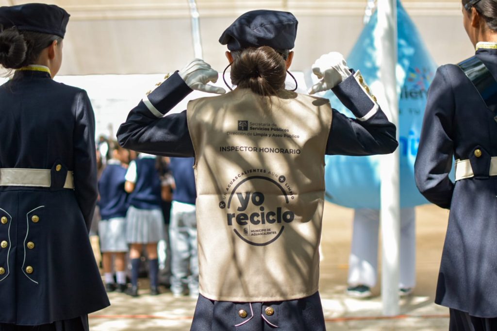 El presidente municipal de Aguascalientes, Leo Montañez, rindió honores a la bandera en conjunto con alumnos y docentes de la escuela primaria Alejandro Topete del Valle, en donde entregó chalecos a niños que serán inspectores honorarios del programa Yo Reciclo, en aras de impulsar el cuidado al medio ambiente y la separación de materiales para darles un segundo uso.