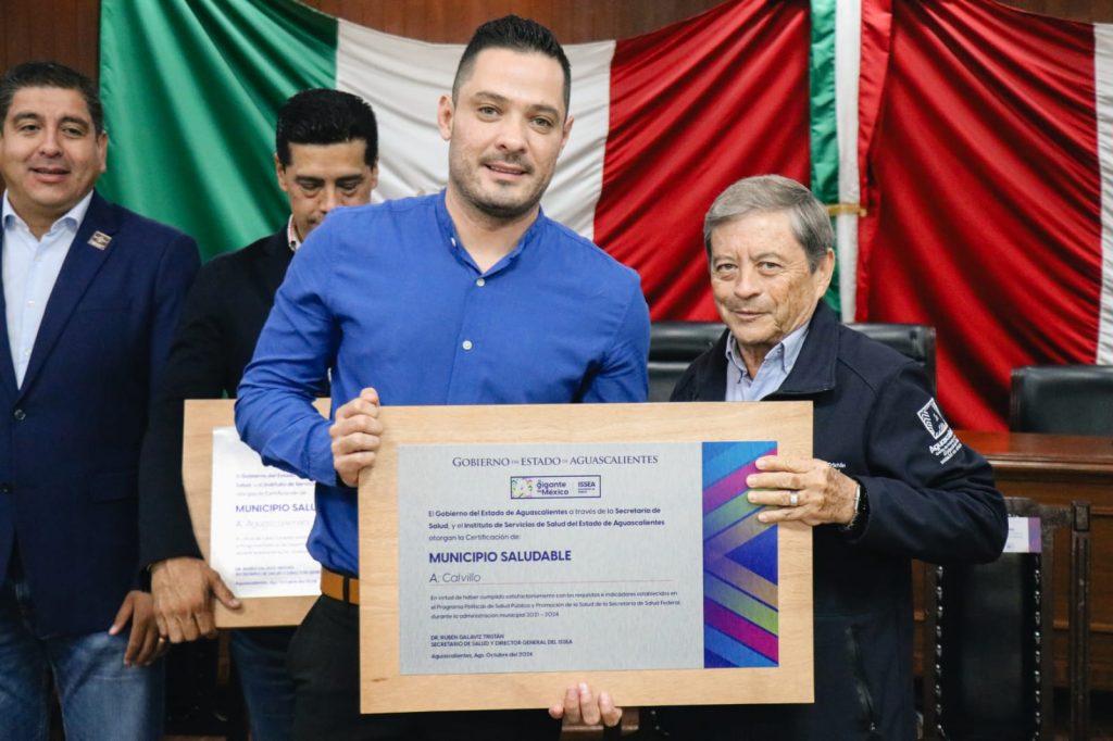 El alcalde Daniel Romo Urrutia, recibió de manos del secretario de Salud y director General del ISSEA, Rubén Galaviz Tristán, la placa que certifica a Calvillo como #MunicipioSaludable, quien mencionó que este reconocimiento impulsa la visión de seguir trabajando para construir un municipio más saludable, inclusivo y sostenible para todas las familias.
