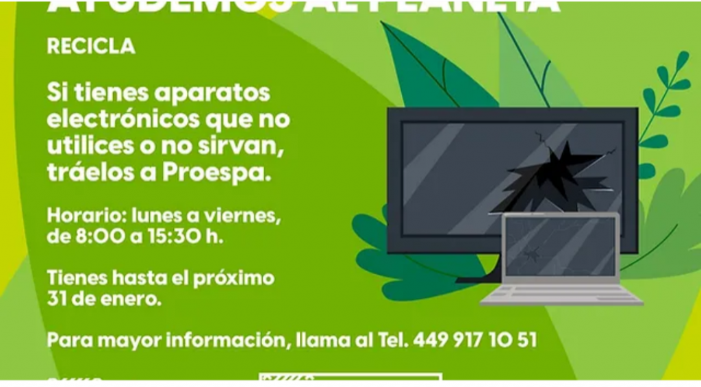El Gobierno del Estado, a través de la Procuraduría Estatal de Protección al Ambiente (Proespa), invita a la población a participar en la campaña de recolección de aparatos electrónicos que ya no sirvan o estén en desuso; el objetivo es reciclarlos y así contribuir al cuidado del planeta.Las personas interesadas en participar, deberán entregar sus dispositivos a más tardar el 31 de enero de 2025 en las instalaciones de la Proespa, en Av. de la Convención sur No. 102, Interior 202, colonia Agricultura, de lunes a viernes, de las 8:00 a 15:30 horas.