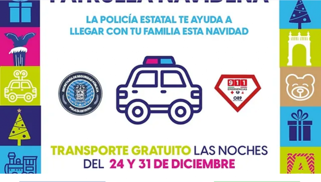 A través del Programa “Patrulla Navideña”, la Secretaría de Seguridad Pública del Estado (SSPE) brindará apoyo de transporte gratuito en la víspera de Navidad y en la noche de Año Nuevo a las personas o familias que por alguna razón no alcancen el transporte público para que puedan llegar a su destino. Así lo dio a conocer el titular de la SSPE, Manuel Alonso García, quien detalló que a partir de las 22:00 horas, tanto el día 24 como el 31 de diciembre, las patrullas y unidades pertenecientes a la Universidad de la Policía y Ciencias de la Seguridad, así como a la Dirección General de Reinserción Social, realizarán su respectivo recorrido en las avenidas Convención de 1914, Aguascalientes, Siglo XXI y Poliducto.
