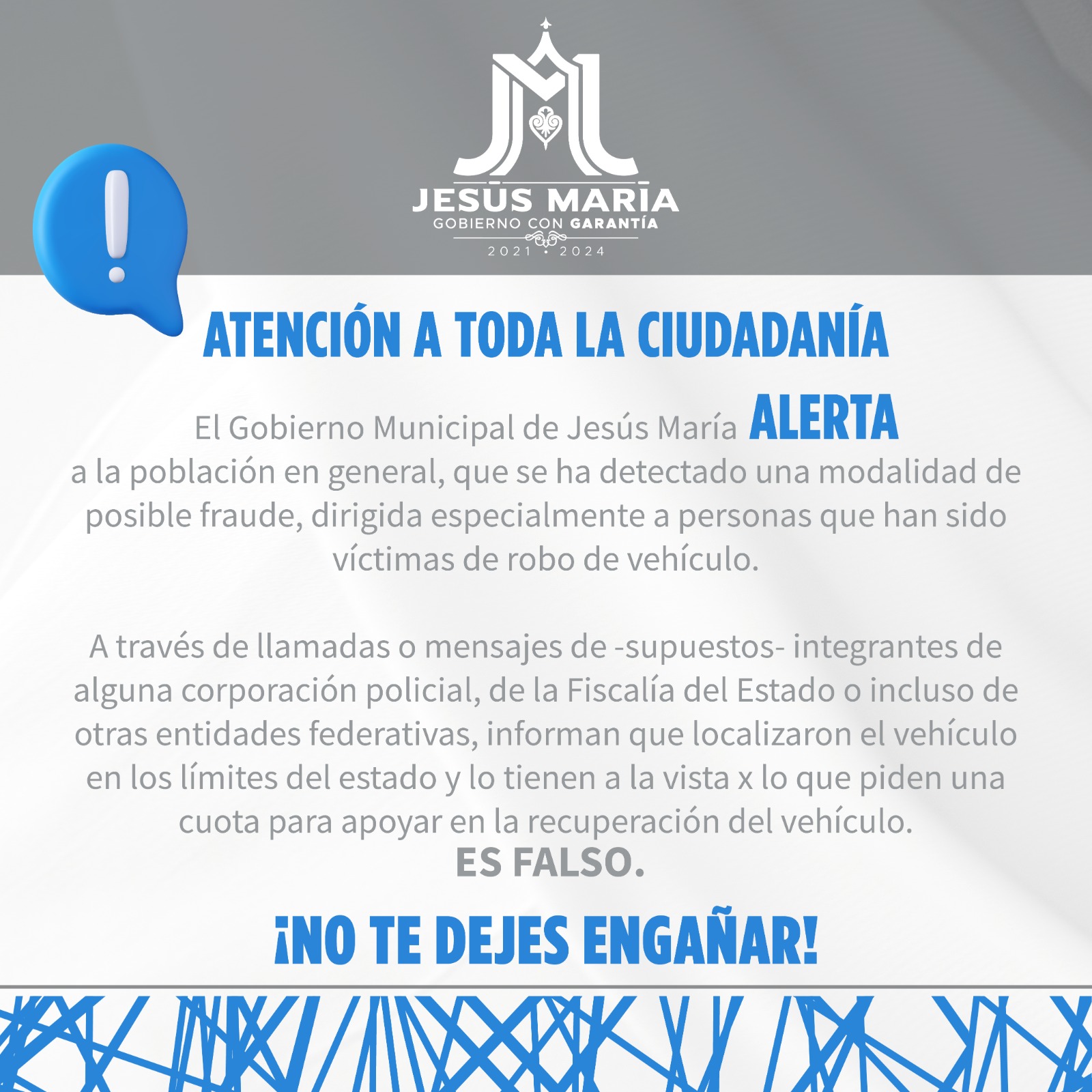 El Gobierno Municipal de Jesús María a través de la Secretaría de Seguridad Pública y Vialidad, informa que se ha detectado una modalidad de fraude por lo que se exhorta…