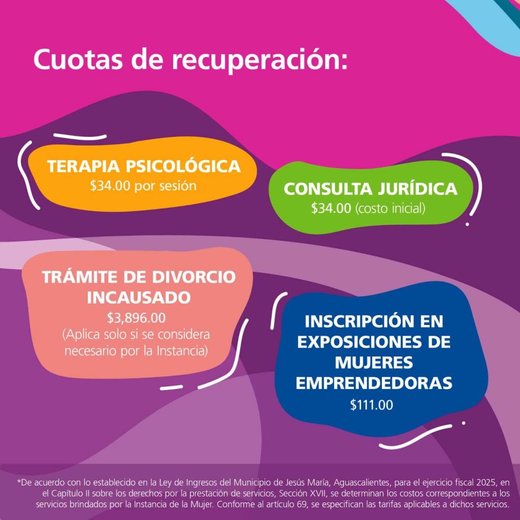 La titular del área, Lic. Patricia Alvarado, informó que la mayoría de estos servicios son gratuitos, sin embargo, hay algunos que tienen un costo de recuperación como el caso de la terapia psicológica y asesoría jurídica, cuyo costo es de 34 pesos por sesión, lo que permite a más mujeres acceder a un acompañamiento profesional.