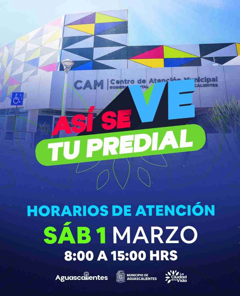 El Municipio de Aguascalientes, a través de la Secretaría de Finanzas informa que este sábado, 1 de marzo, el Centro de Atención Municipal (CAM) brindará servicio para pago de predial, de 8:00 a 15:00 horas.