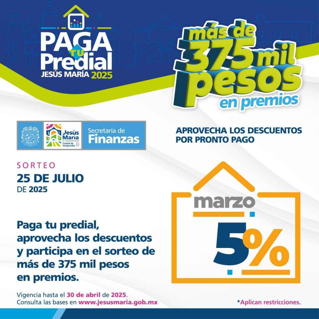El Gobierno Municipal de Jesús María, a través de la Secretaría de Finanzas, invita a la ciudadanía a realizar el pago del impuesto predial en el mes de marzo para obtener un cinco por ciento de descuento y participar en el sorteo de más de 375 mil pesos en premios.