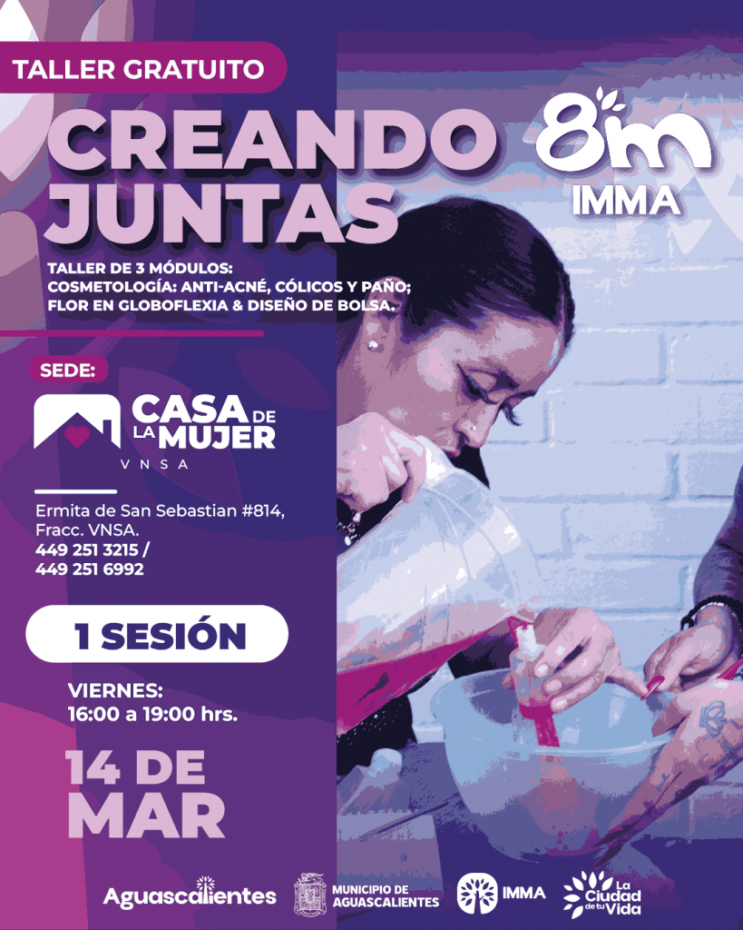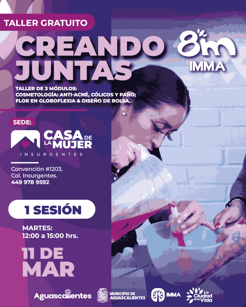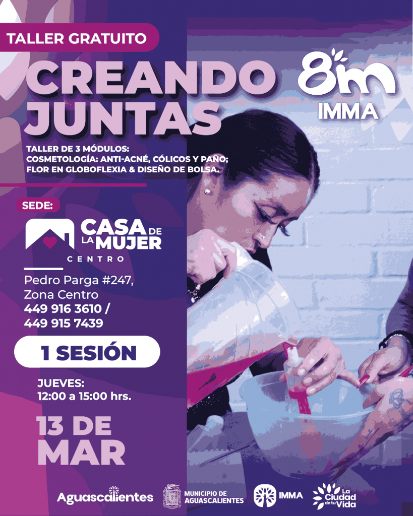El Municipio de Aguascalientes, a través del Instituto Municipal de la Mujer (IMMA), invita a la ciudadanía a participar en los talleres gratuitos «Creando Juntas», una iniciativa que busca fortalecer la sororidad, el empoderamiento y la expresión creativa de las mujeres en un ambiente seguro.