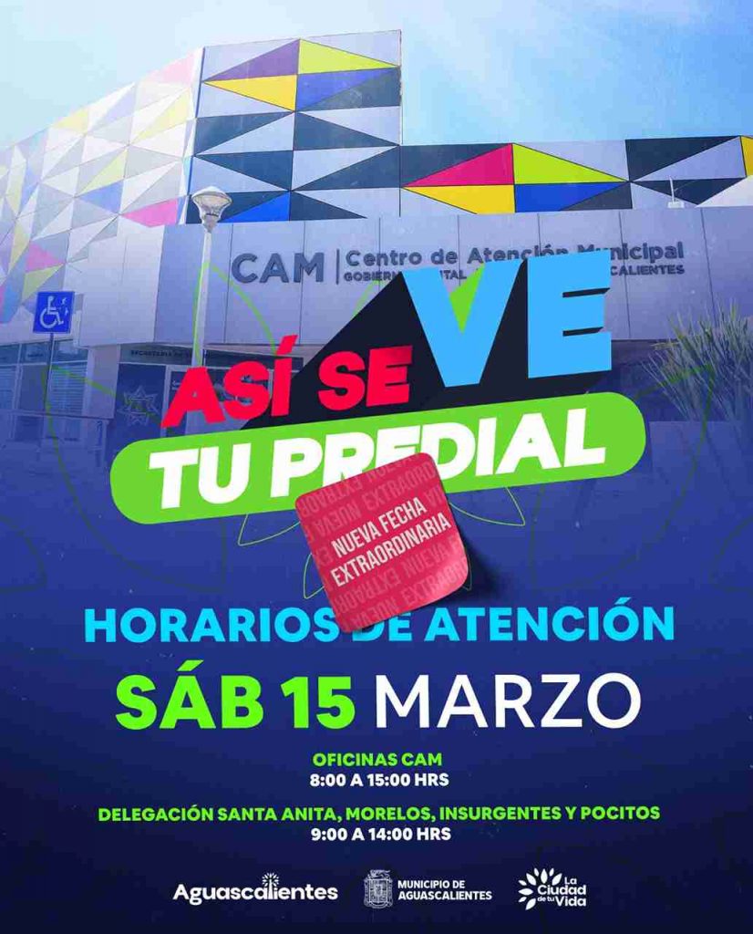 La titular de la Secretaría de Finanzas del Municipio de Aguascalientes, Miriam Rodríguez Tiscareño, dio a conocer que para facilitar a la ciudadanía el pago de predial, este sábado 15 de marzo, el CAM dará servicio de 8:00 a 15:00 horas.