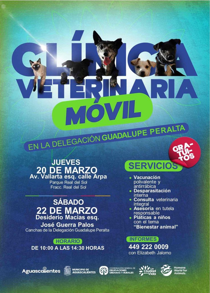 El Municipio de Aguascalientes dio a conocer las nuevas fechas de la Clínica Veterinaria Móvil que estará ofreciendo diferentes servicios para perros y gatos en colonias y fraccionamientos de Aguascalientes como parte de un programa para impulsar el bienestar animal.