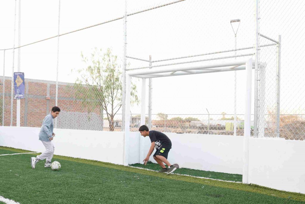 Se instaló sistema de riego, trotapista, andadores, mobiliario urbano cómo bancas, botes de basura, gimnasio al aire libre, área para mascotas, cancha de fútbol de pasto sintético, rehabilitación de cancha de usos múltiples, malla ciclónica perimetral y luminarias, señaló el titular de la Secretaría de Obras Públicas Municipales, Miguel Ángel Huizar Botello.