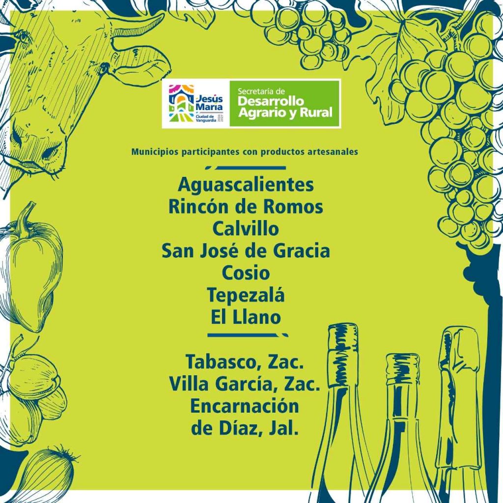 César Medina comentó que quienes asistan podrán degustar de productos hechos en Jesús María, y de otros municipios invitados como Calvillo, Cosío, El Llano, Rincón de Romos, Tepezalá y San José de Gracia, cuyos expositores mostrarán sus productos hechos de manera artesanal como quesos, vinos, mezcal, cajetas, frutos secos, helados, miel, pan, dulces típicos, postres, salsas machas, carne seca, kombucha, así como artesanías.