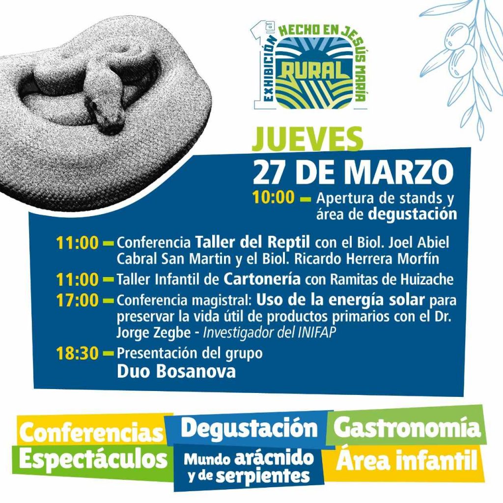 El jueves 27 de marzo se realizará el Taller del Reptil, posteriormente la conferencia “Uso de la energía solar para preservar la vida útil de productos primarios con el doctor Jorge Zegbe, investigador del Inifap, y al final del se contará con la actuación del Duo Bossanova.