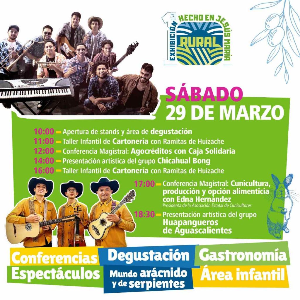 El sábado 29 de marzo, la Caja Solidaria participará también con una charla sobre agrocréditos, posteriormente el grupo Chicahual Bong dará un concierto, más tarde se llevará a cabo una conferencia sobre “Cunicultura: producción y opción alimeticia”, y para finalizar se presentarán los Huapangueros de Aguascalientes.
