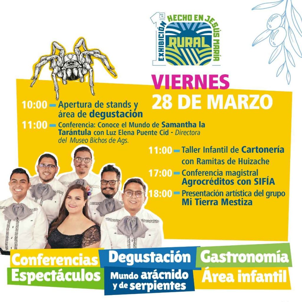 Para el viernes 28 de marzo, se llevará a cabo la conferencia “Conoce el mundo de Samantha la Tarántula”, posteriormente una conferencia sobre agrocréditos con SIFIA, y para cerrar con broche de oro, se llevará a cabo la presentación artística del grupo Mi Tierra Mestiza.