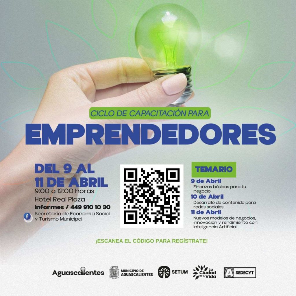 La Secretaría de Economía Social y Turismo Municipal, en colaboración con la Secretaría de Desarrollo Económico, Ciencia y Tecnología (SEDECYT), invita a empresarios, emprendedores y público en general a participar en las siguientes capacitaciones que se llevarán a cabo los días 9, 10 y 11 de abril en el Hotel Real Plaza, ubicado en Adolfo López Mateos 320, Zona Centro, Aguascalientes, de 9:00 a 12:00 horas.