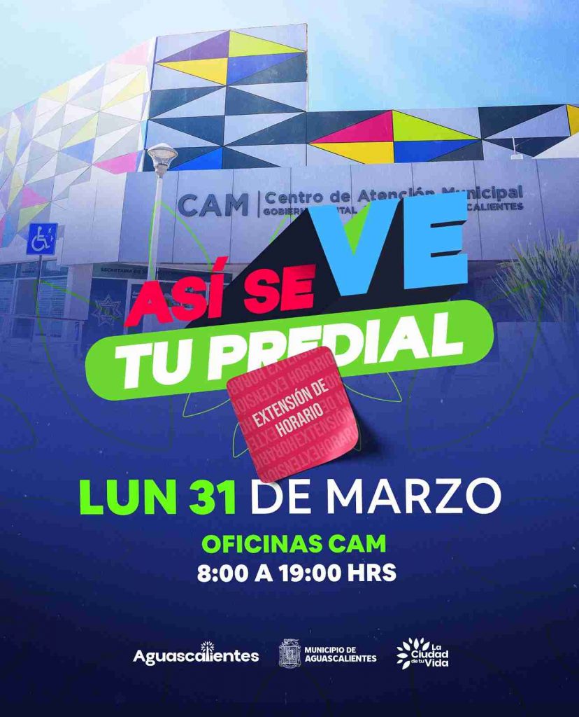 La titular de la Secretaría de Finanzas del Municipio de Aguascalientes, Miriam Rodríguez Tiscareño, informó que para facilitar el pago de predial y que más ciudadanos aprovechen el descuento de 10 por ciento por pronto pago, el sábado 29 y domingo 30 de marzo de 2025, el Centro de Atención Municipal (CAM) abrirá sus puertas de las 8:00 de la mañana a las 3:00 de la tarde.