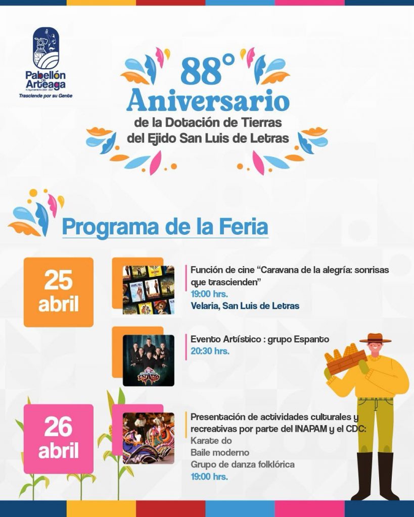 Este viernes 25 de abril da inicio la Feria del 88° Aniversario de la Dotación de Tierras del Ejido San Luis de Letras, una de las festividades más representativas de nuestro municipio. Durante tres días, viviremos juntos momentos llenos de identidad, tradición, talento y alegría.