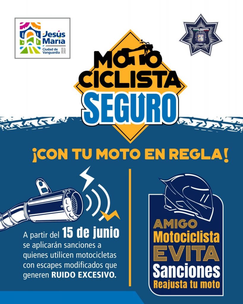 Explicó que se otorgará un período de gracia de 15 días para que los propietarios de motocicletas con dispositivos de escape modificados o ruidosos puedan retirarlos y realizar las adecuaciones necesarias, de manera que, a partir del 15 de junio los elementos de la Secretaría de Seguridad Pública y Vialidad de Jesús María comenzarán a aplicar las sanciones correspondientes.