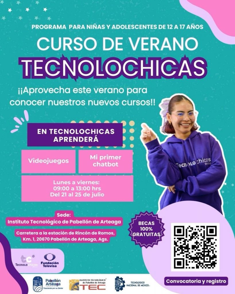 INJUPA, el TecNM Campus Pabellón, Fundación Televisa y el H. Ayuntamiento te invitan al Curso de Verano Tecnolochicas, dirigido a niñas y adolescentes de 12 a 17 años. 👩💻