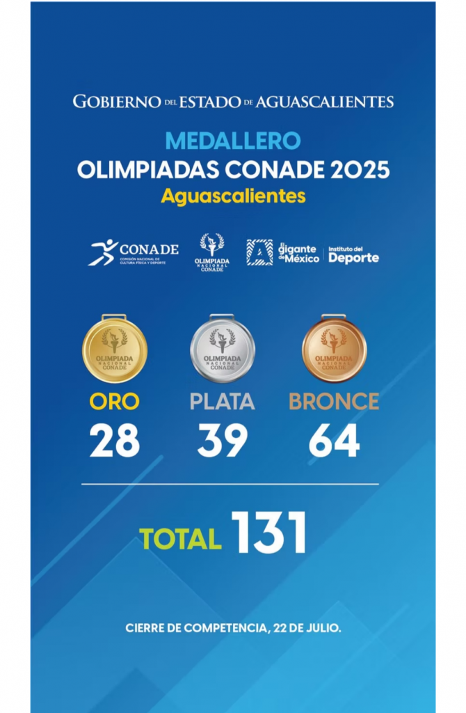 Las y los deportistas de Aguascalientes concluyeron su participación en la Olimpiada Nacional CONADE 2025, la justa más importante a nivel amateur en el país, con un total de 131 medallas, de las cuales 28 fueron de oro, 39 de plata y 64 de bronce.