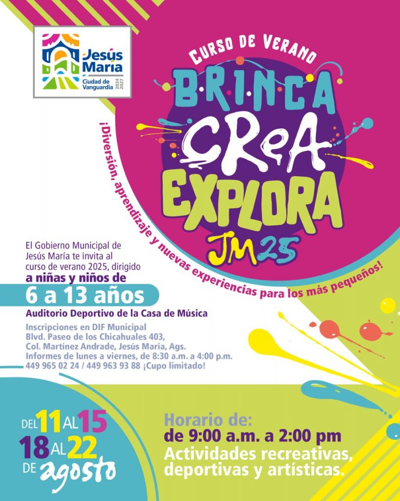 Con el propósito de ofrecer espacios seguros, formativos y recreativos durante el periodo vacacional, el Gobierno Municipal de Jesús María, a través del DIF, invita a niñas y niños de entre 6 y 13 años a participar en el curso de verano “Brinca, Crea y Explora”.
