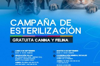María Teresa Rendón Esquivel, coordinadora general de Salud informa que se realizarán nuevas fechas de esterilización en conjunto con la Secretaría de Salud del Estado de Aguascalientes, mismas que se realizarán los próximos lunes 8 y martes 9 de septiembre en la Delegación Villas y en el Barrio de La Purísima, respectivamente.