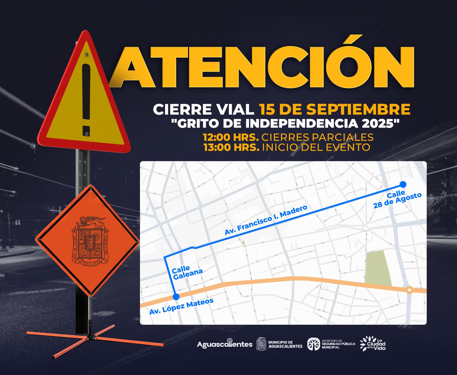 Se invita a la ciudadanía a salir con anticipación y atender las instrucciones de los policías viales, ya que desde el sábado 13 de septiembre se implementará el cierre en calle Madero y Morelos hacia el poniente, para la instalación de estructuras y puestos temporales, los cuales permanecerán hasta la madrugada del día 16.