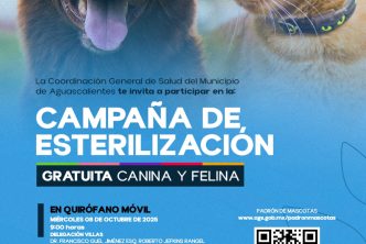 La coordinadora general de Salud del Municipio de Aguascalientes, María Teresa Rendón Esquivel, informa que el próximo 8 de octubre el Quirófano Veterinario Móvil Municipal visitará el fraccionamiento Benito Palomino Dena, mientras que el 9 de octubre estará en la escuela primaria José María Morelos y Pavón en Norias de Paso Hondo, para ofrecer servicios de esterilización, vacunación antirrábica y desparasitación.