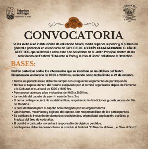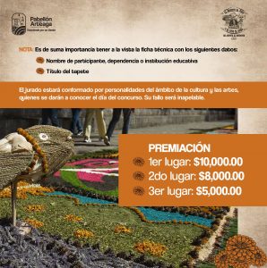 Te invitamos a participar en el Concurso de Tapetes de Aserrín, conmemorando el Día de Muertos, este 1 de noviembre en el Jardín Principal.