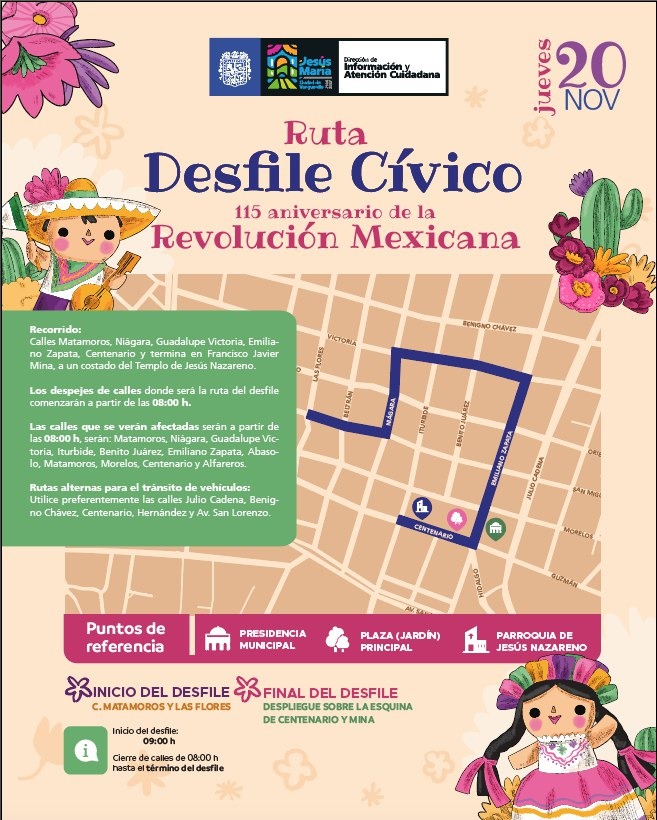 Los despejes de calles comenzarán desde las 08:00 horas, por lo que se recomienda a la ciudadanía tomar precauciones y utilizar rutas alternas. El Gobierno Municipal de Jesús María a través de la Dirección de Información y Atención ciudadana invita a la población a disfrutar de esta conmemoración en la que participarán academias deportivas, charros y escaramuzas, diversas instituciones educativas, entre otros contingentes.