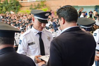 Al entregar constancias, imponer grados y tomar la protesta de ley correspondiente a 45 nuevas policías y 33 nuevos policías municipales, Leo Montañez, dijo que brindarán mayor confianza e inspirarán a niñas, niños y jóvenes en las colonias y comunidades y que como primeros respondientes lleven la cultura de paz a la sociedad.