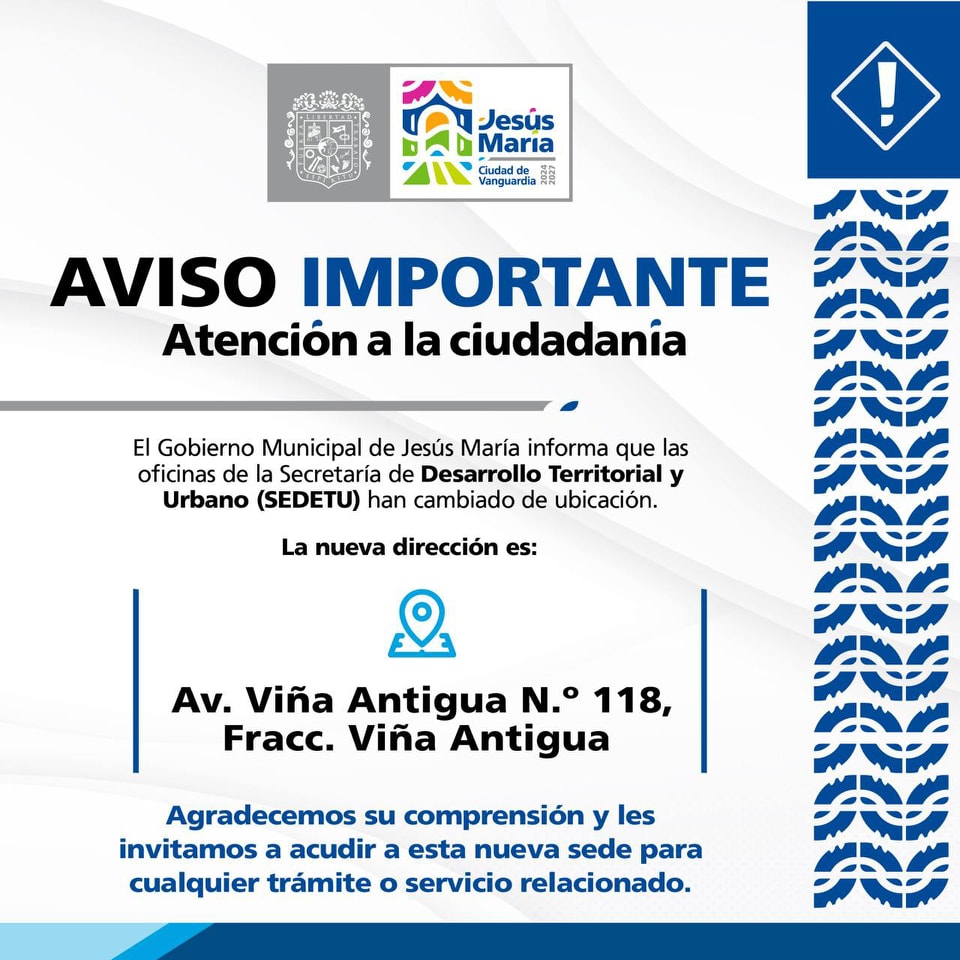 Con el objetivo de ofrecer a la ciudadanía instalaciones más amplias y funcionales, el Gobierno Municipal de Jesús María informa que las oficinas de la Secretaría de Desarrollo Territorial y…