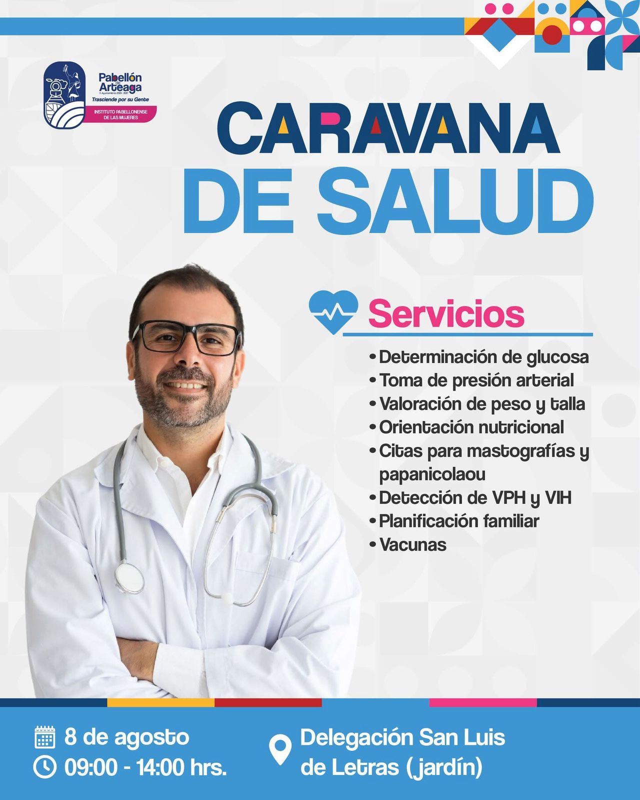 ¡La salud es primero! Por parte del Instituto Pabellonense de la Mujer, este 8 de agosto acompáñanos a la Caravana de Salud en la Delegación San Luis de Letras (jardín).…