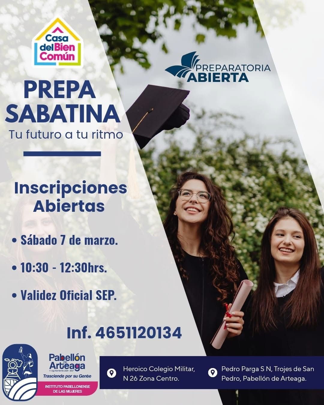 ¿Tienes pendiente terminar la prepa?¡Esta es tu oportunidad! El H. Ayuntamiento de Pabellón de Arteaga, a través del Instituto Municipal Pabellonense de las Mujeres, impulsa más oportunidades para que puedas…