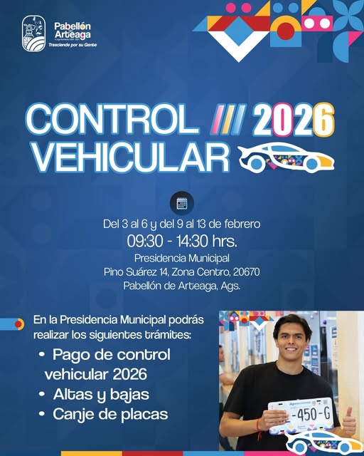Control Vehicular 2026 en Pabellón de Arteaga ✨🚗 Acude a la Presidencia Municipal y realiza tus trámites de Control Vehicular 2026 de manera rápida y sencilla. 📅 Fechas: del 3…